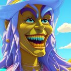 A whimsical character with vibrant purple hair and a pointy hat smiles wide, adorned with colorful jewelry and a playful outfit against a bright blue sky and fluffy clouds.