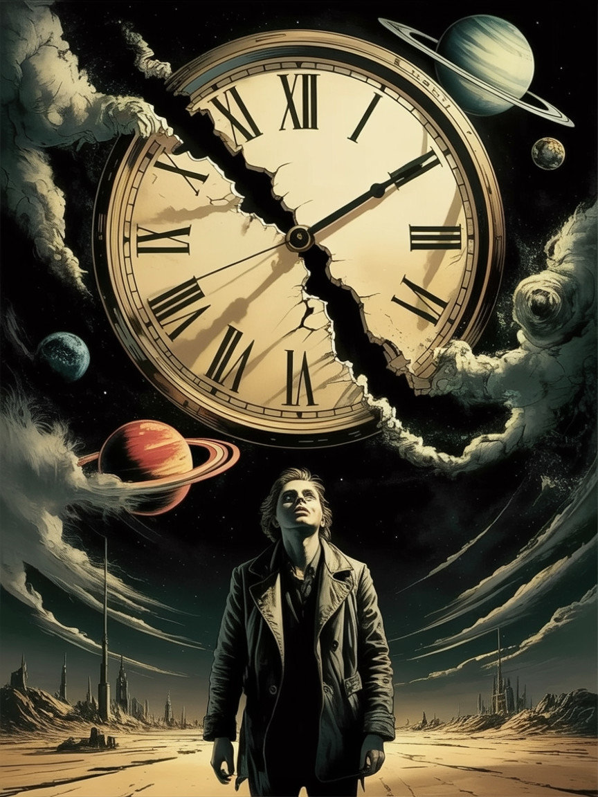 A man stands beneath a shattered clock, surrounded by celestial bodies and a dramatic landscape. The scene evokes themes of time, the cosmos, and existential contemplation.