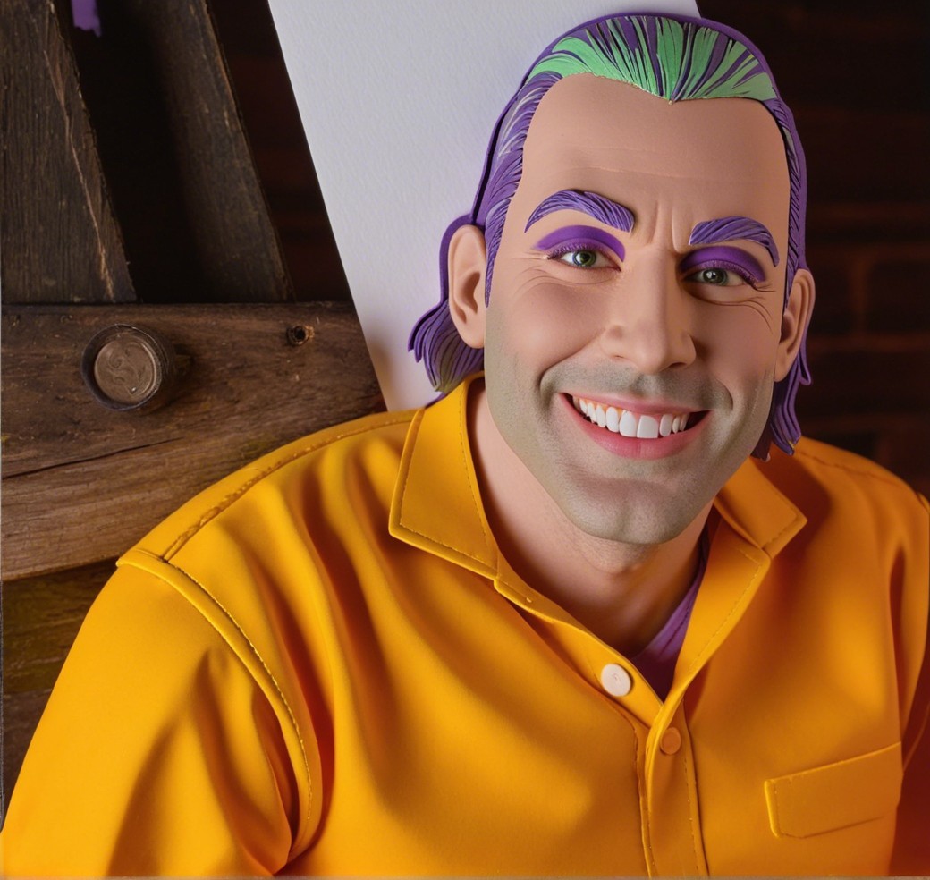 A vibrant, stylized bust of a character with green hair and purple accents, wearing a bright yellow shirt, set against a brown box backdrop. The expression is cheerful and captivating.