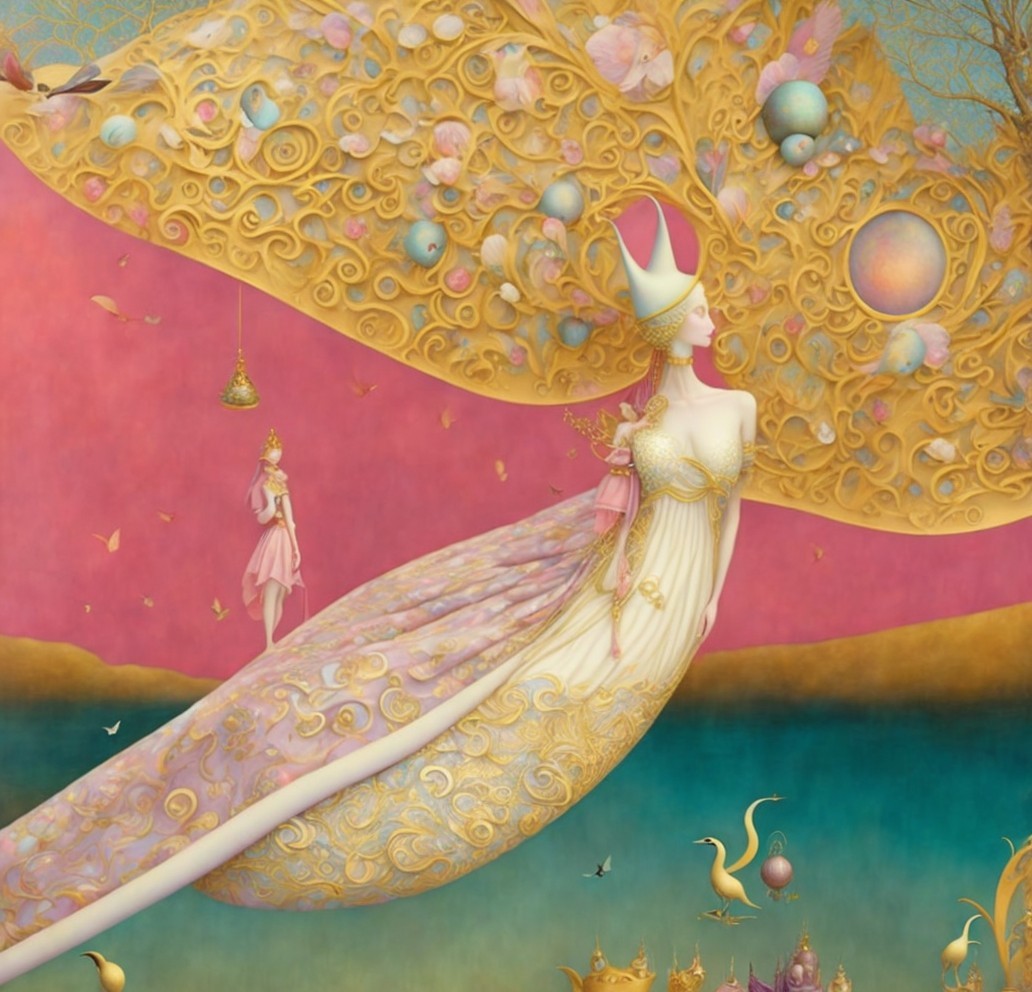 A highly detailed, psychedelic art piece features a nude female figure with large pink rabbit ears, a gold headdress, and gold earrings. She has a very long, ornate, lavender and gold serpent-like lower body, and a pink cloak flowing behind her. She is positioned diagonally in front of a