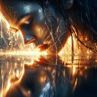 A close-up of a woman's face partially submerged in shimmering water, illuminated by golden light. Cascading droplets enhance the ethereal atmosphere, creating a sense of serenity and beauty.