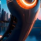A futuristic female figure in a sleek, metallic suit stands against a backdrop of a high-tech city. A large, glossy orb reflects the vibrant skyline, merging technology and elegance.