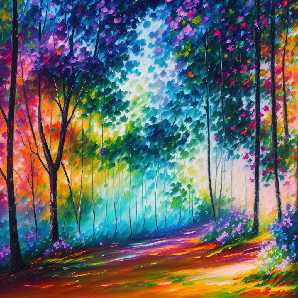 : Blurred green, blue tree, rainbow sky, soft pastel swirling pink wildflowers, oil on canvas, heavy rain, zoom burst effects, blurred sunny path, rainbow sky,Leonid Afremov-style, nature, floral, Impressionism, vibrant colors, textured brushstrokes, dynamic composition, detailed foliage, atmospheric perspective, artistic interpretation, rich color palette, dramatic lighting,