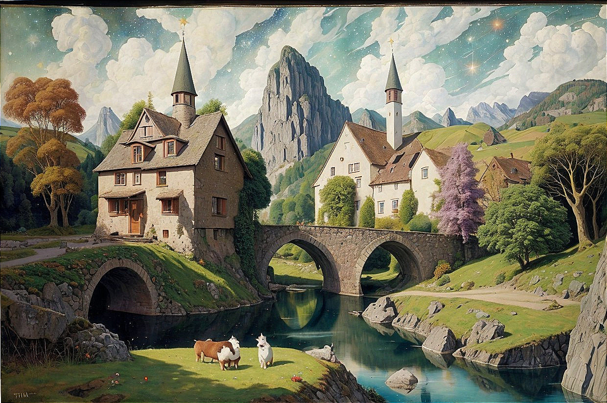 A picturesque village with white houses and steeples nestled among lush hills, a river in the foreground, under a blue sky with fluffy clouds.