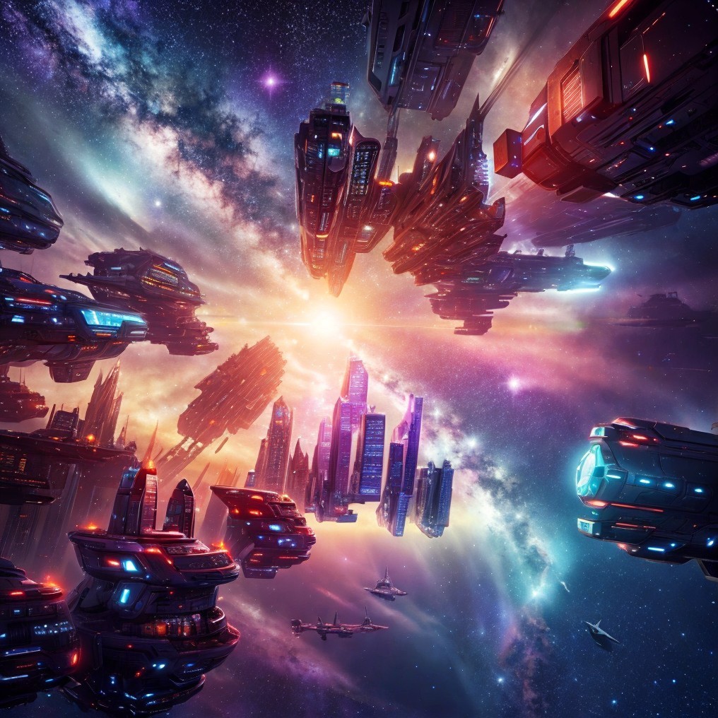A futuristic cityscape at dusk with skyscrapers, hovering ships, and a starry sky.
