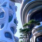Futuristic buildings with organic, fluid shapes rise alongside a serene waterway, featuring large windows and integrated greenery, all under a clear blue sky, blending nature with innovative architecture.