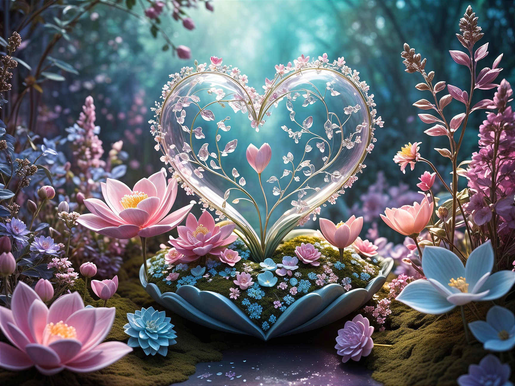 A captivating blend of mystical floral art and surreal landscapes, this work features intricate botanical sculptures and soft colors, evoking nostalgia and transcendental beauty in a dreamlike atmosphere.