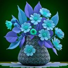 A vibrant floral arrangement in a decorative vase, featuring blue and purple flowers with intricate petals and leaves, set against a lush green background.