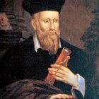 A wise, bearded man in a dark cloak holds a telescope, gazing thoughtfully. The full moon glows in the starry background, creating a mysterious, scholarly atmosphere.