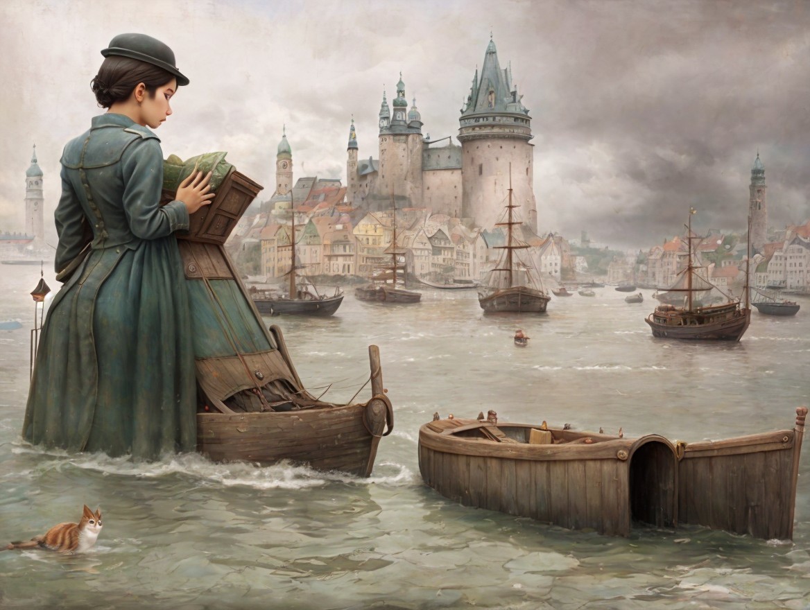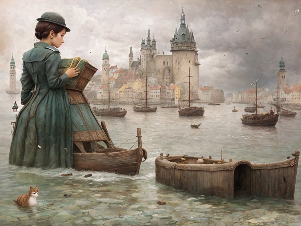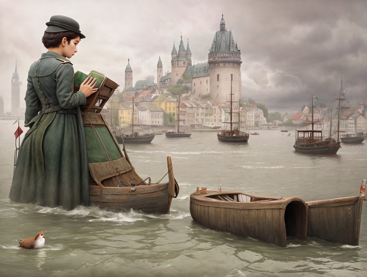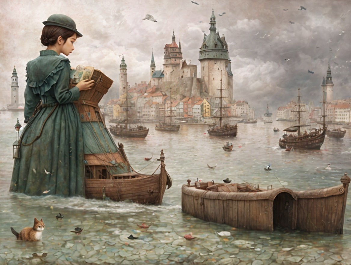 Victorian-dressed woman reading book on dock with harbor view, castle, seagulls, and