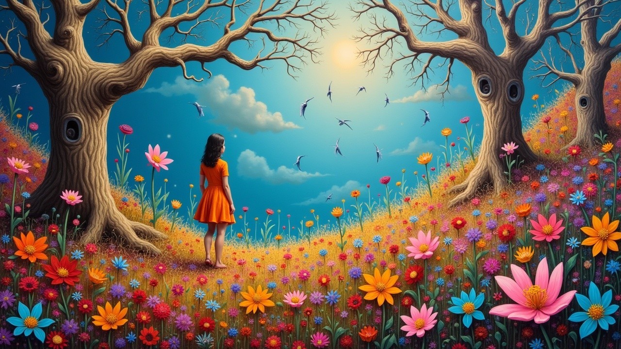 A girl in a vibrant orange dress stands amidst a colorful meadow, surrounded by blooming flowers and barren trees, under a bright blue sky filled with butterflies and a glowing sun.