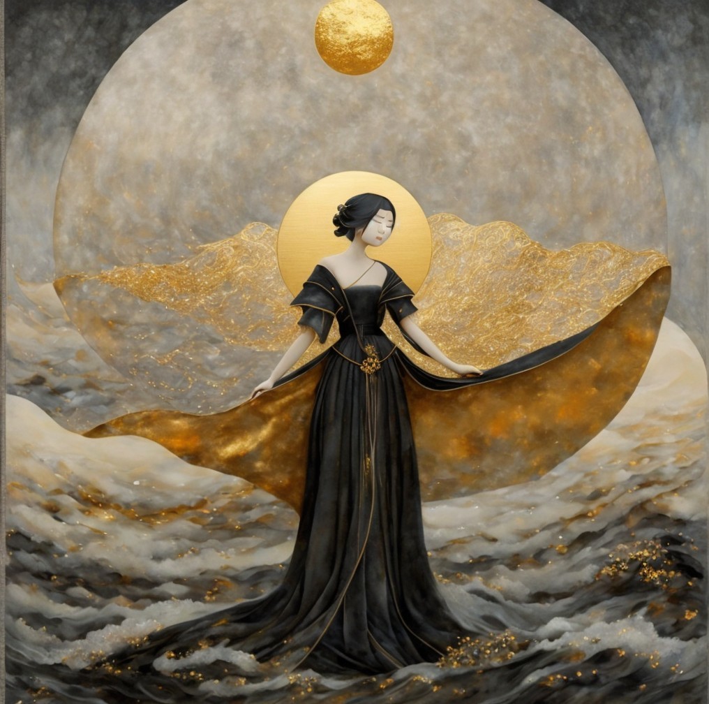 A serene figure in a flowing black gown stands against a backdrop of swirling waves and golden motifs, embodying elegance and tranquility amid a majestic landscape.