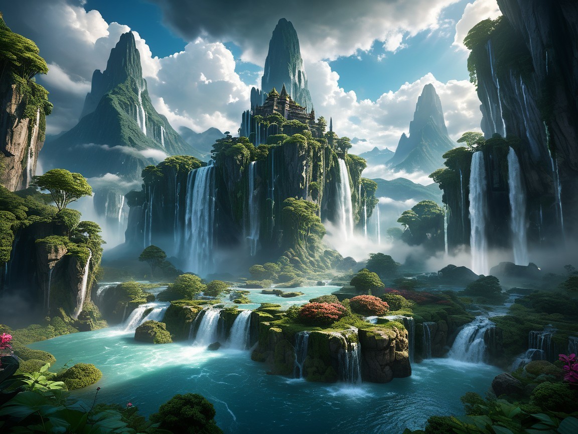 A massive floating mountain adorned with cascading waterfalls and lush hanging gardens, enveloped in clouds, features radiant rivers spilling into the sky, captured in a stunning cinematic scene.