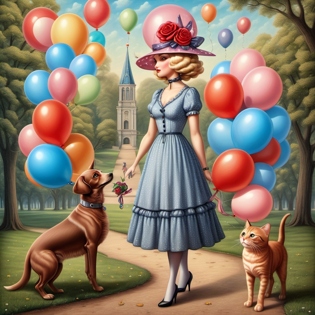 Anthropomorphic dogs dressed elegantly at a whimsical outdoor party with colorful balloons and a cat.