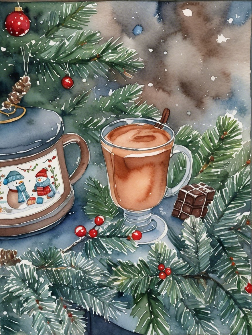 A cozy winter scene featuring a steaming cup of hot chocolate topped with whipped cream, surrounded by greenery, a festive jar, and a dusting of snow outside the window.