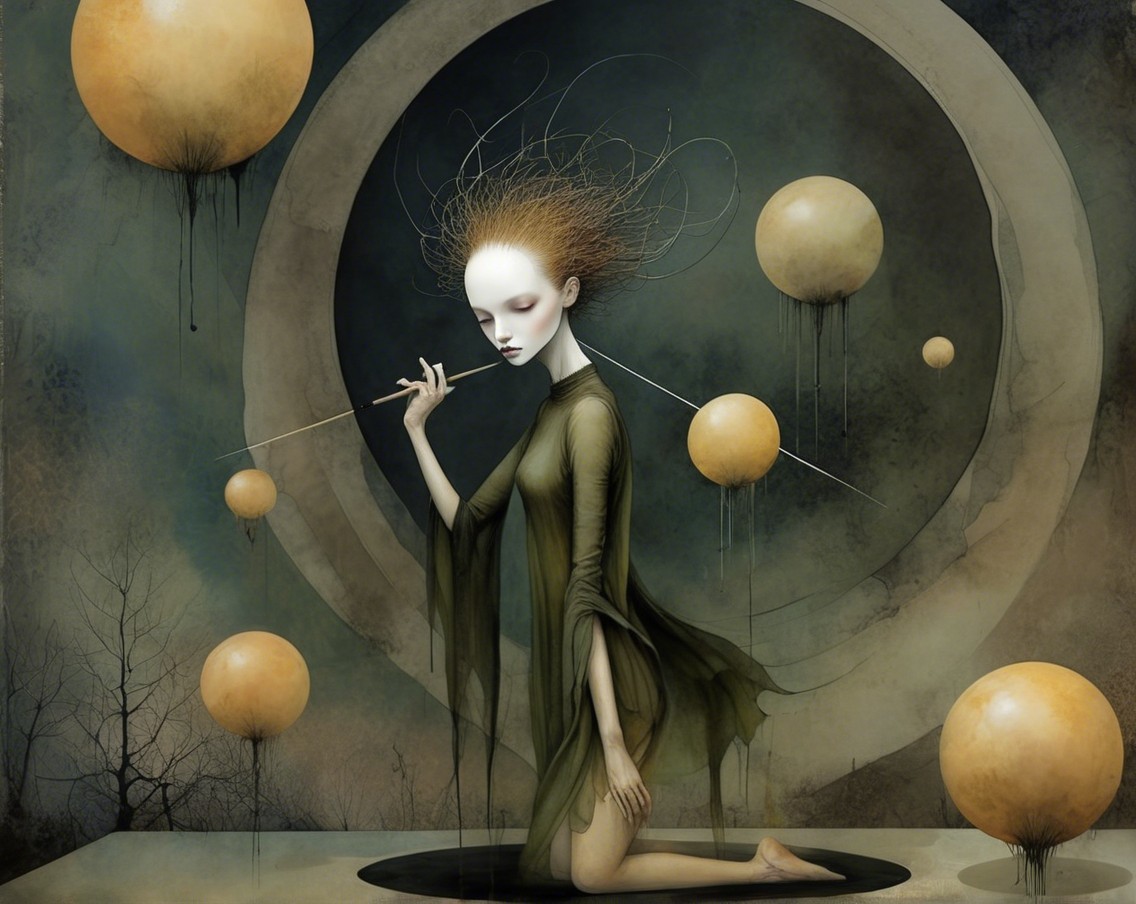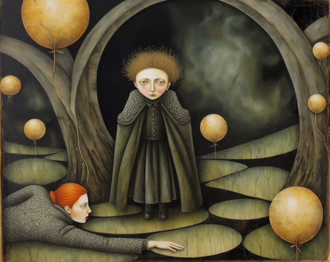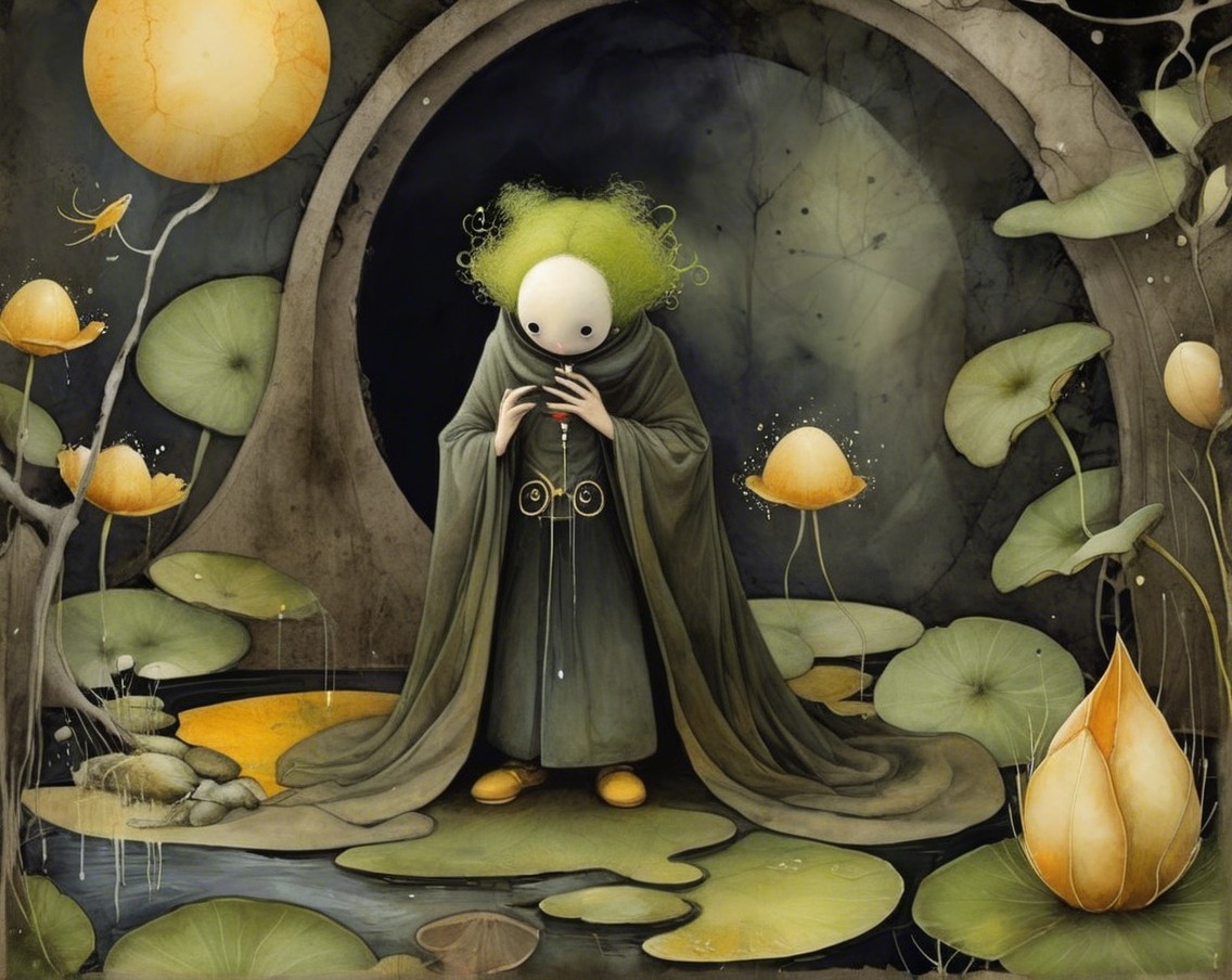 A surreal landscape unfolds with towering, bulbous trees and a figure in a flowing gown, gazing toward a mysterious doorway bathed in golden light. Shadows and soft colors create an ethereal mood.
