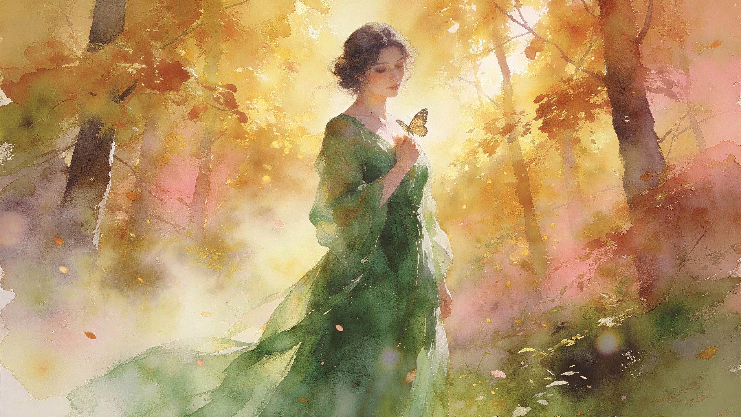 A watercolor painting of a dreamy forest scene depicts a young woman with dark hair in an elegant updo, wearing a flowing, sheer green gown. She stands amidst tall trees with autumnal gold and orange foliage, bathed in bright, ethereal sunlight that filters through the leaves. A delicate yellow butterfly rests on her hand.