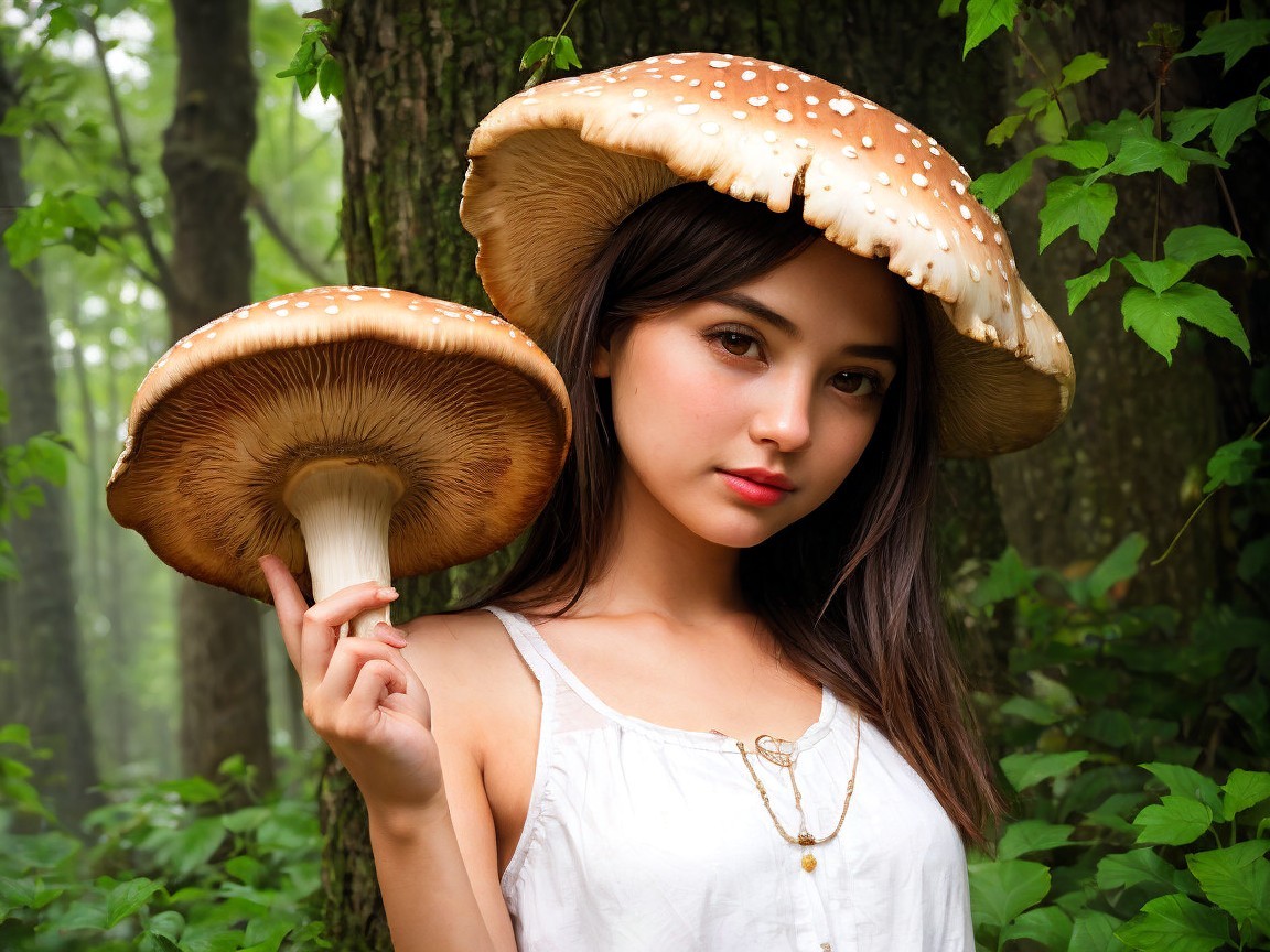 A young woman stands in a forest, holding a large mushroom with a knife. She has a mushroom cap atop her head and exhibits a serene expression, surrounded by lush greenery.