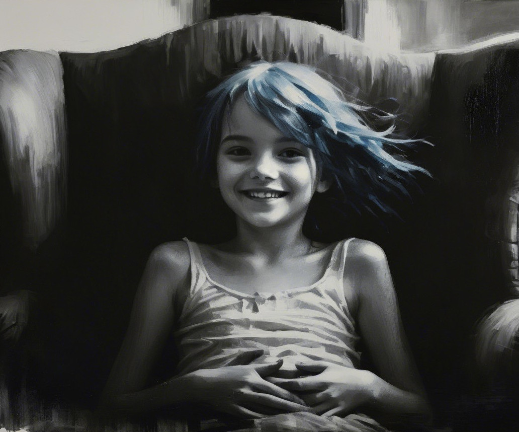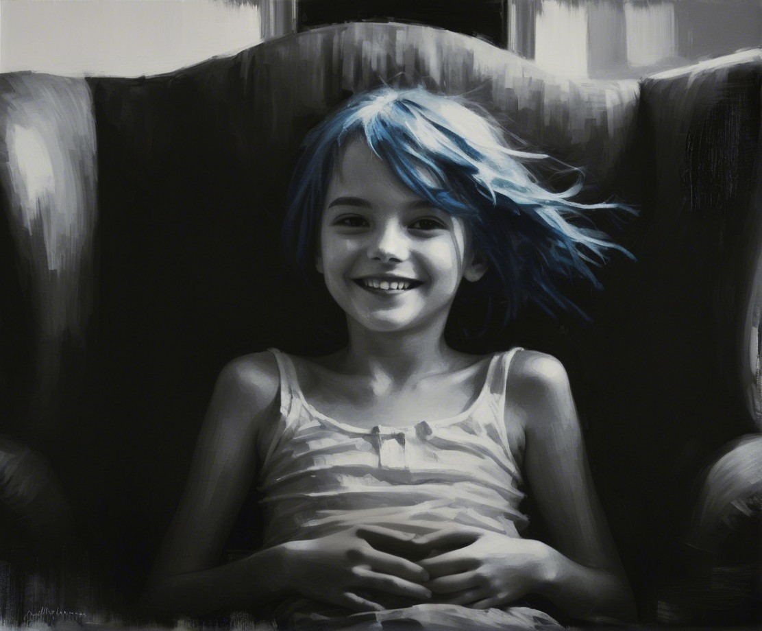 Prompt: portrait, girl, vivid blue hair, impasto oil painting, dark, abstract, ominous, style of Dave McKean, Jeremy Mann, Christopher Bucklow and Stephen Gammell