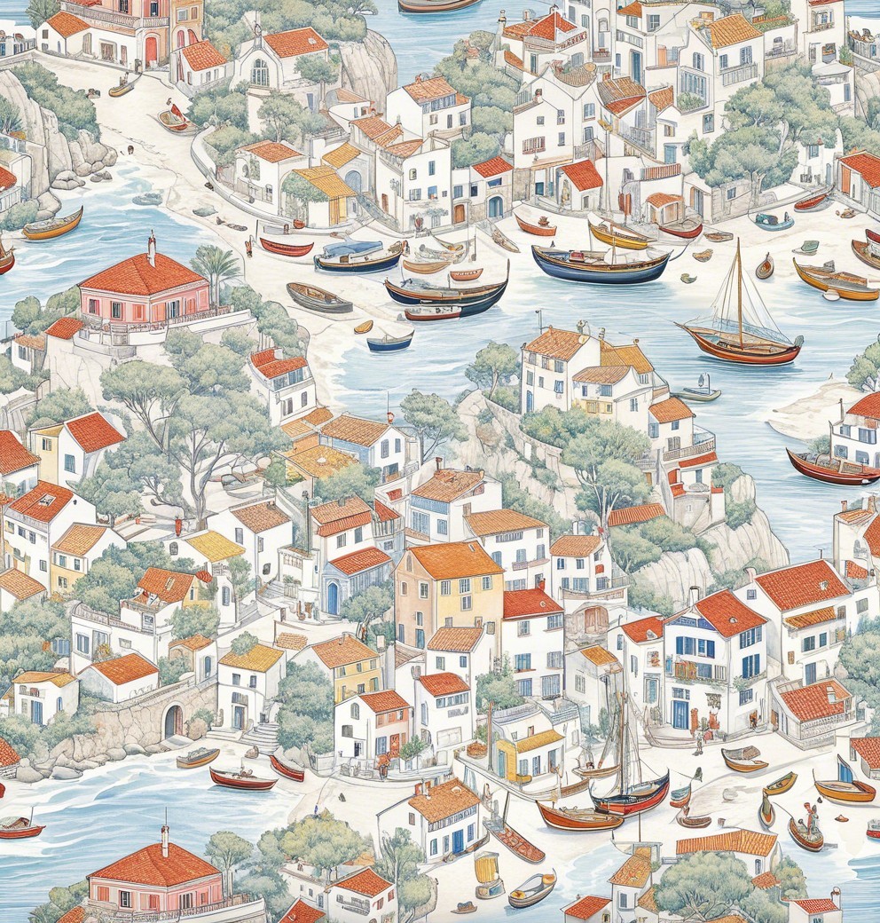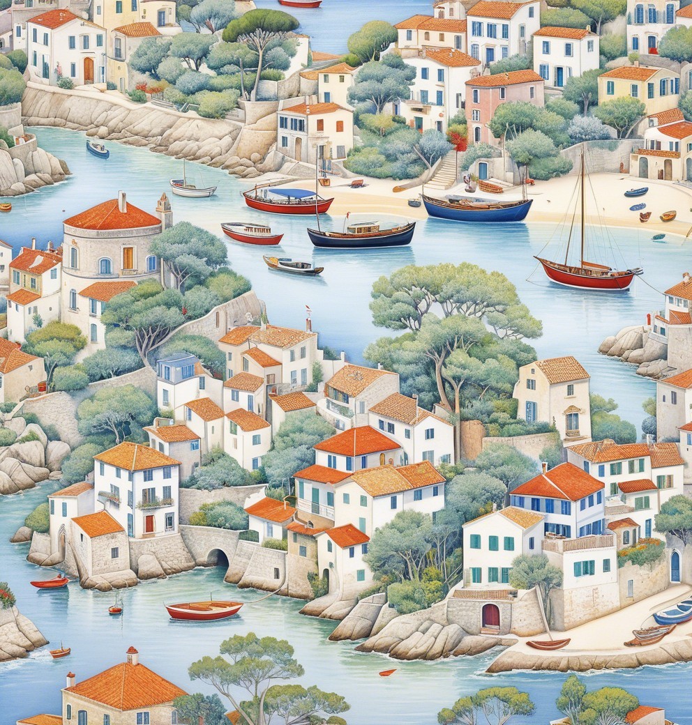 A Mediterranean village on scattered islands with charming houses nestled among rocky shores and lush greenery, dotted with colorful boats.