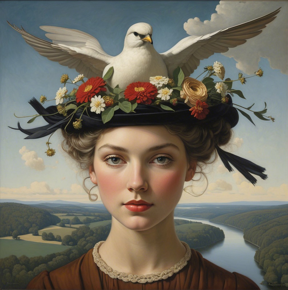 A serene woman adorned with a floral crown and a dove perched above her head, gazes thoughtfully. The backdrop features lush landscapes and a calm river, creating a peaceful atmosphere.