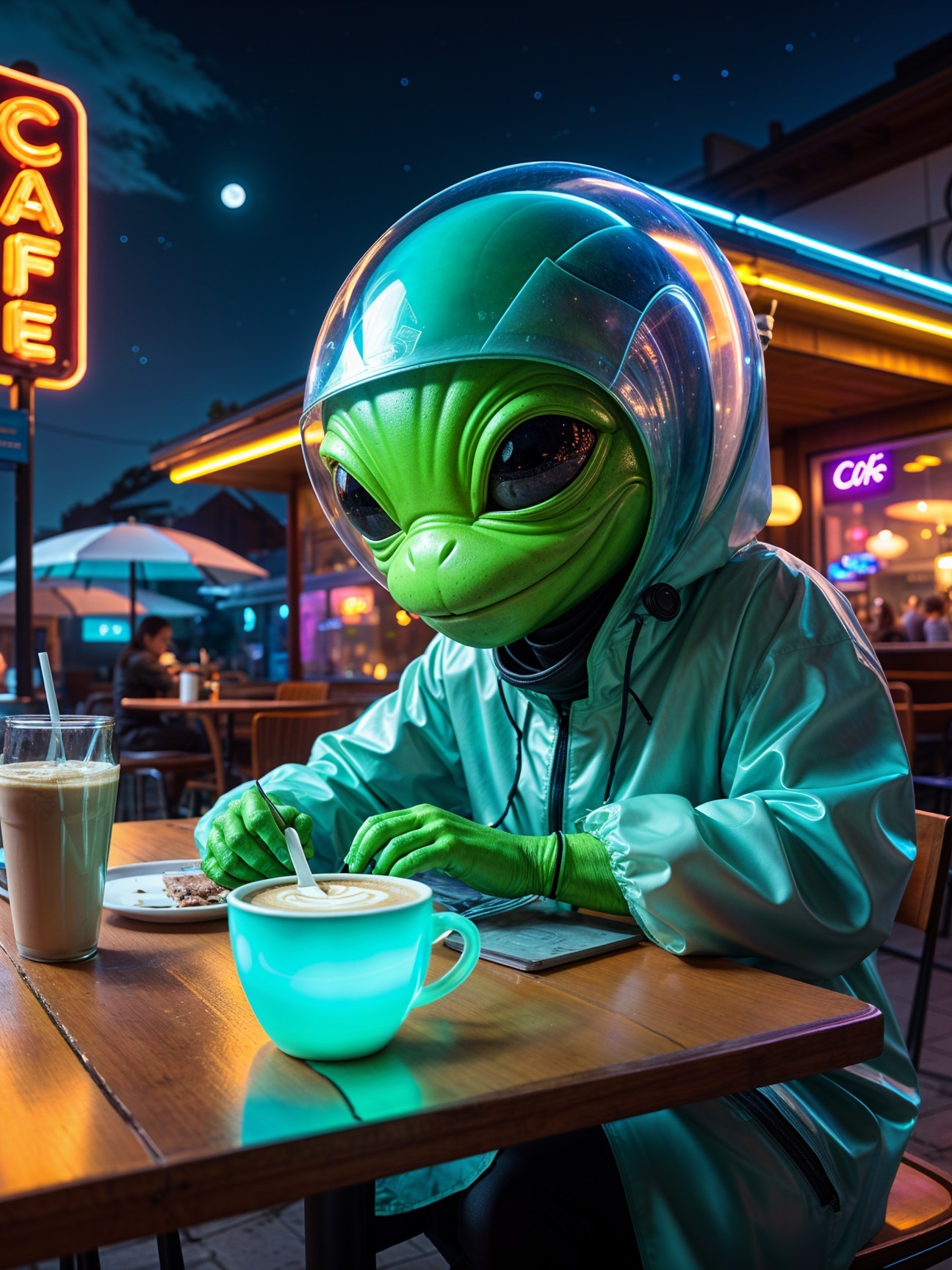 An alien in a shiny, reflective jacket sits at a café table under neon lights, enjoying a glowing drink and cookies, with a moonlit sky above. The scene blends humor and sci-fi charm.