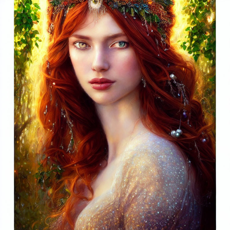 Fantasy, beautiful woman, head and should portrait, long auburn hair, beautiful eyes, intricate headdress embellished with hollies, ivy, pearls, warm ambiance, crystal bokeh in the style of Josephine Wall