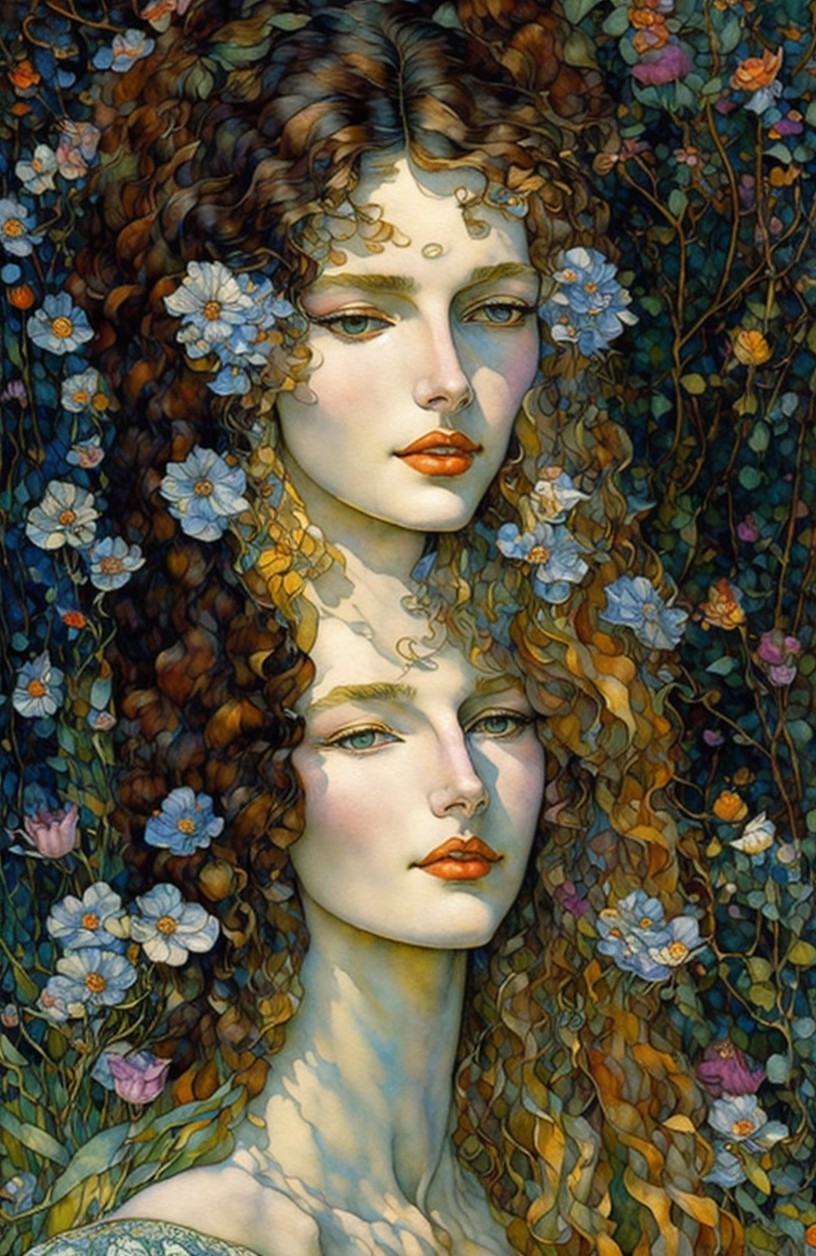 A detailed illustration of a woman with red hair and a patterned dress sitting in front of a stained glass window.