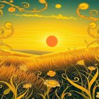 A vibrant sunset glows in shades of gold and yellow, casting light over a field filled with blooming flowers and lush greenery, creating a serene and enchanting atmosphere.
