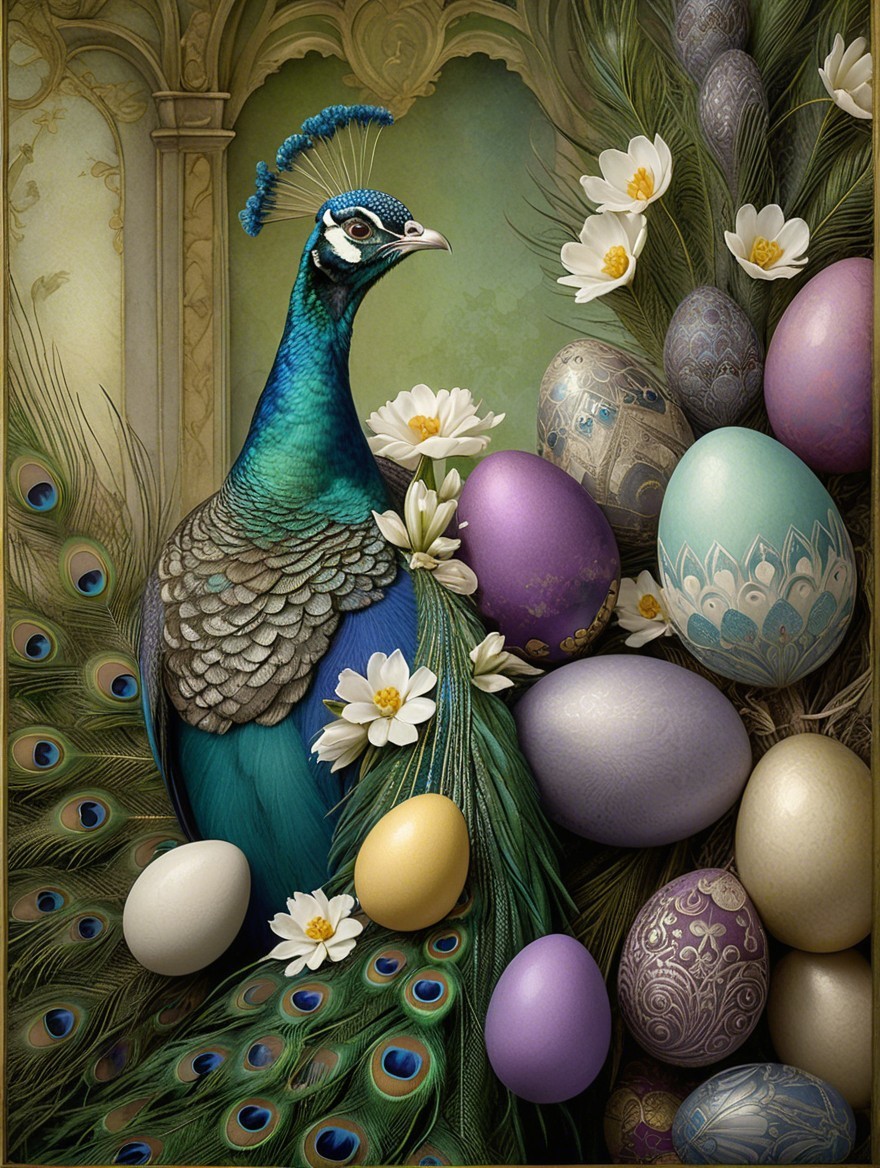 + Prompt:Close up, impish mischievous gorgeous delicate family of Easter peacocks with easter eggs, in the style of Alexander Jansson. by Catrin Welz-Stein, Michael Parkes. By Aubrey Beardsley and Arthur Rackham . .