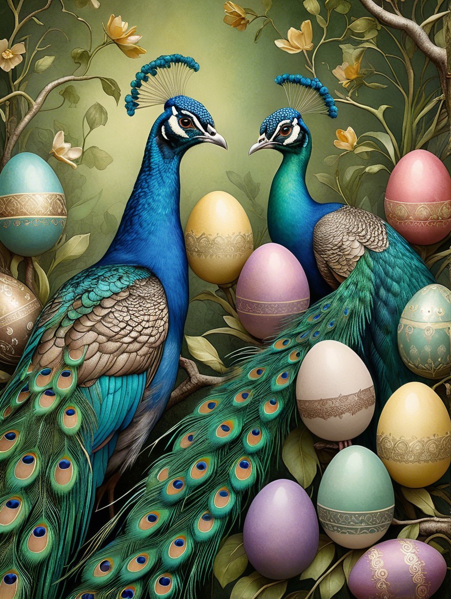 Two vibrant peacocks stand elegantly against a lush backdrop of blossoms and foliage, surrounded by beautifully decorated Easter eggs, creating a serene and festive atmosphere.
