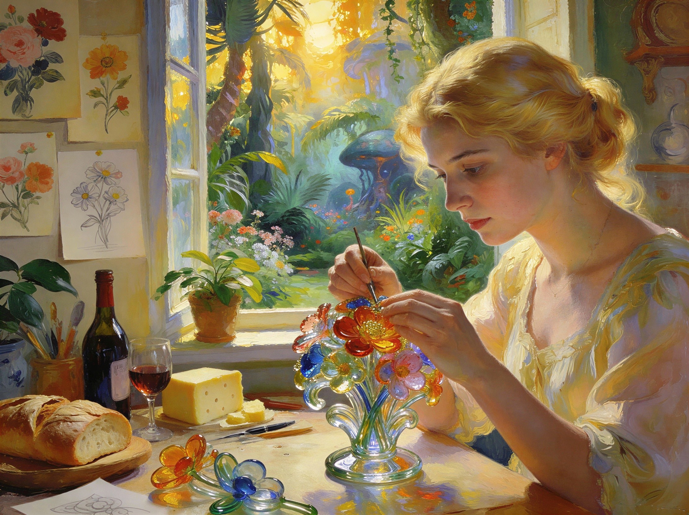 A highly detailed oil painting of a young woman with blonde hair tied back, wearing a light yellow ruffled dress, sitting at a sunlit wooden table indoors. She is focused on painting or assembling a colorful, translucent glass floral arrangement in a glass vase, using a fine brush. On the table, there