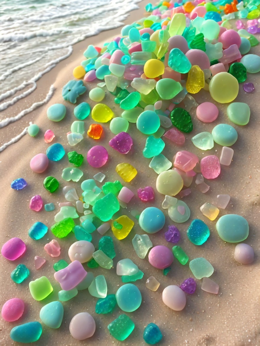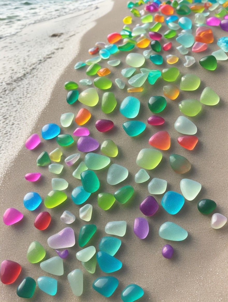 Assorted smooth multicolored sea glass on sandy beach with approaching waves