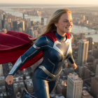 A superhero flying above a city skyline, wearing a blue suit with a red cape and the iconic "S" emblem. Her blonde hair billows as she soars against a sunset sky, embodying strength and courage.