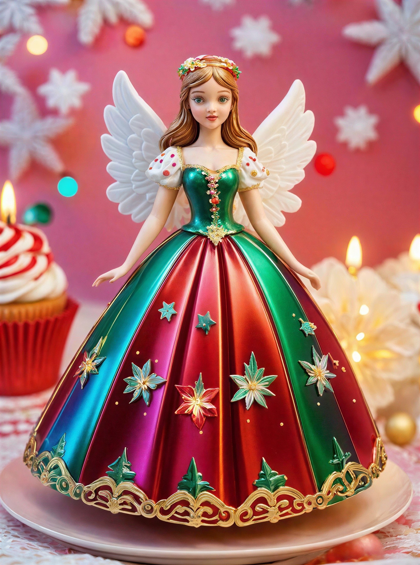 A detailed, full-body shot of a Christmas angel doll, featuring long brown hair, white wings, and a multi-colored dress in shades of green, red, pink, and blue, adorned with star-shaped patterns and gold trim, standing on a white plate with a festive background of pink