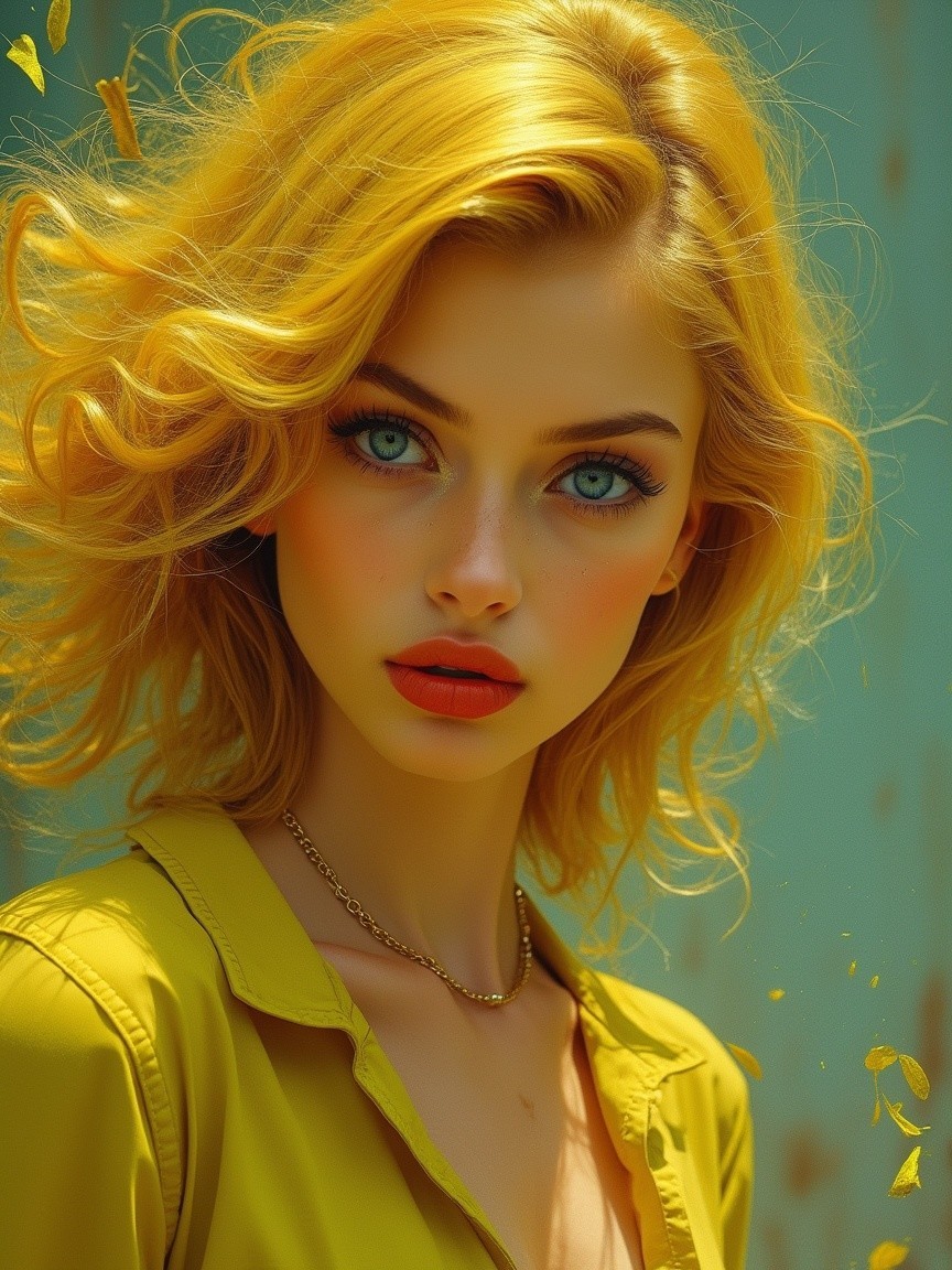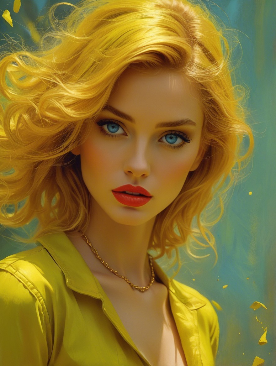 A striking portrait of a woman with flowing golden hair and captivating blue eyes. She wears a vibrant yellow top, exuding charm and confidence against a soft, blurred background.
