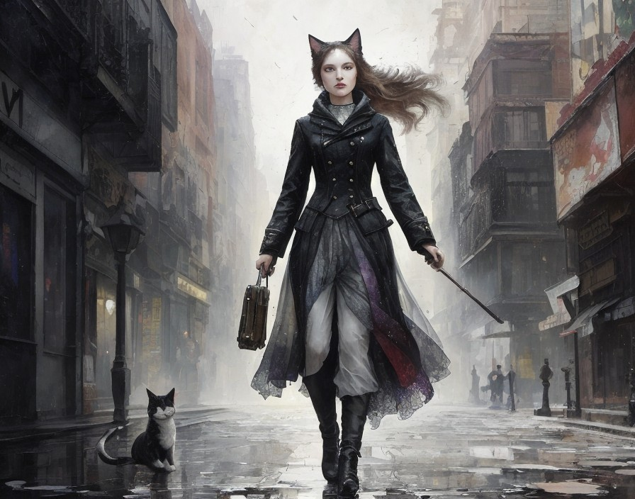 A stylish figure walks down a misty street, wearing a long coat and cat-ear headband, holding a bag and leash. A black-and-white cat accompanies her, adding to the whimsical atmosphere.