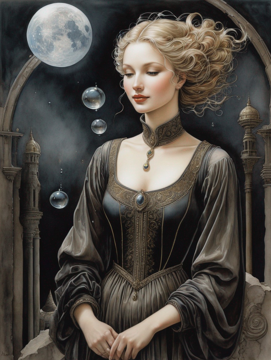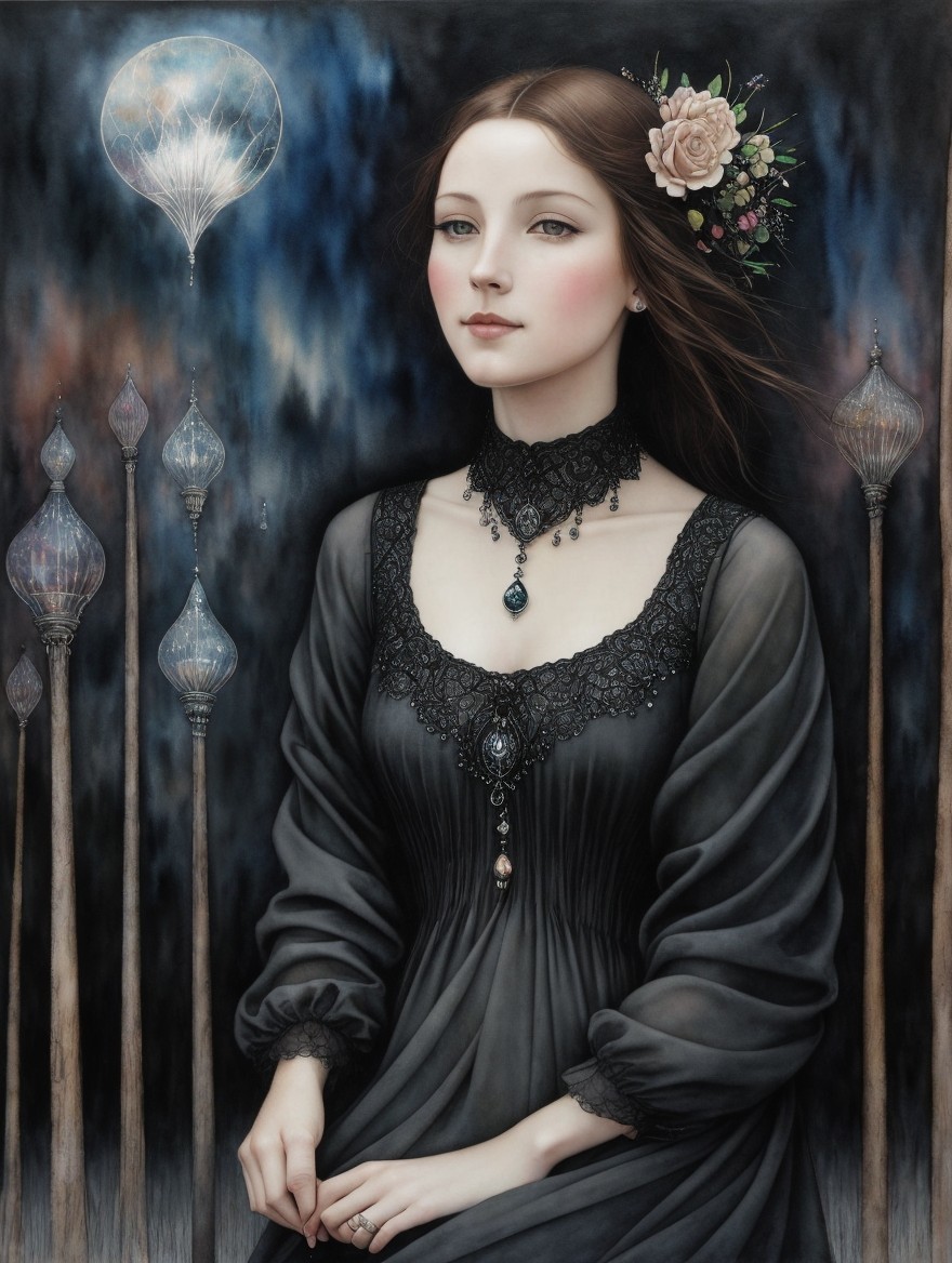 A fantasy artwork of a woman with celestial bodies, holding a glowing orb, evoking a sense of cosmic elegance.