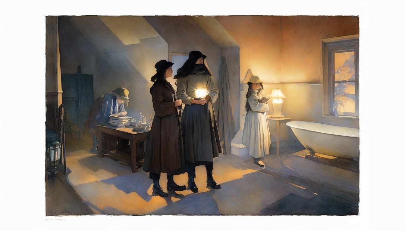 Illustration of cloaked figure on steps by sea at sunset with lighthouse