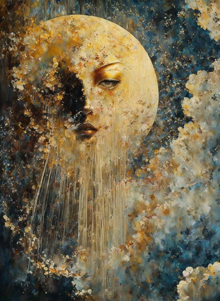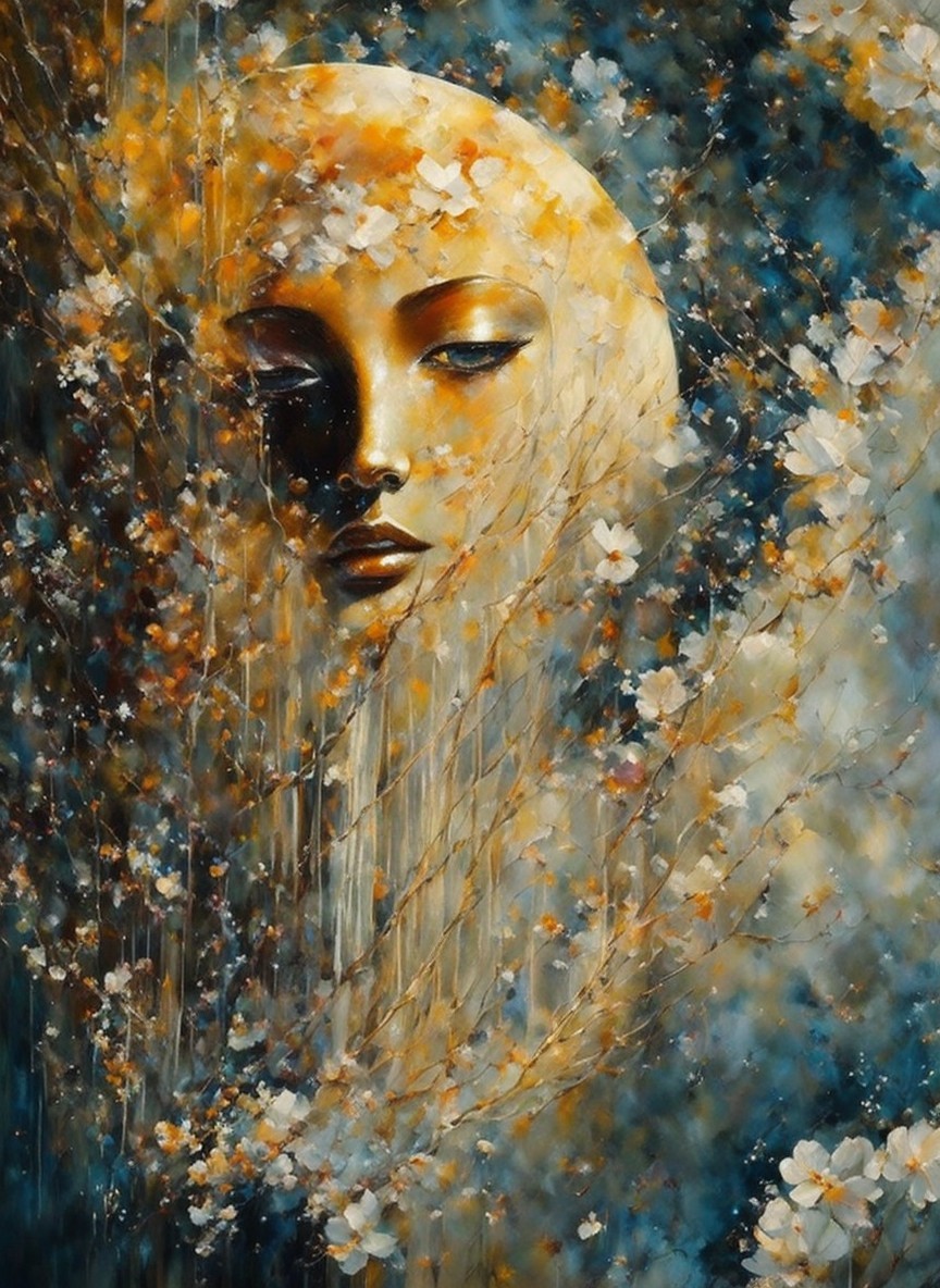A serene portrait of a woman with closed eyes, surrounded by abstract colors and soft floral elements. The blend of hues creates a dreamy, ethereal atmosphere, highlighting her calm expression.