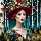 A striking figure with an elaborate floral headdress and a stylish hat, surrounded by lush greenery and colorful blooms, exudes an ethereal beauty in a dreamlike, artistic setting.