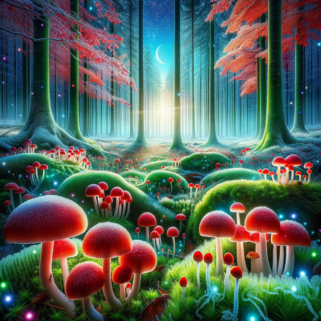 A mystical forest with oversized red mushrooms, a woman in traditional attire, a snowy ground, and an ethereal glow around a distant pagoda.