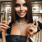 A glamorous woman with long, flowing hair smiles confidently while holding a glass, dressed in elegant jewelry at a stylish event. The ambiance is sophisticated and festive.