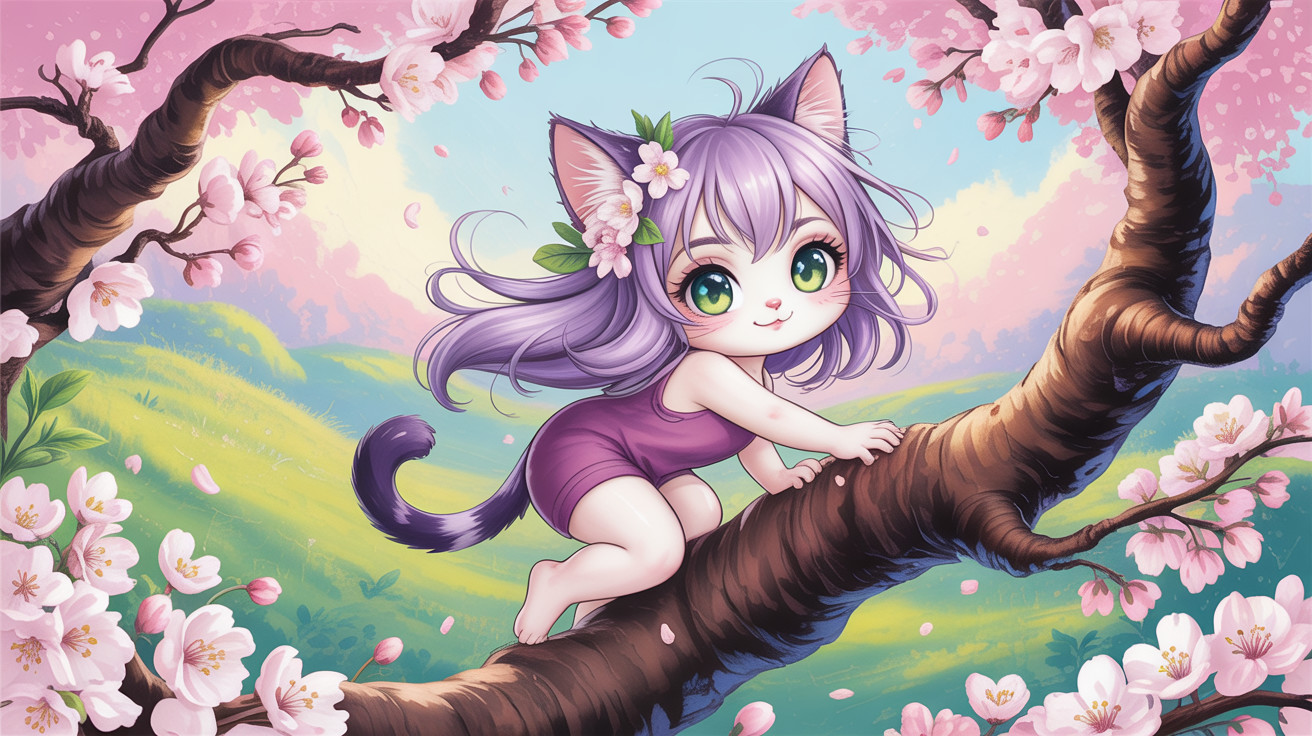 A whimsical anime scene features an adorable catgirl with magical abilities, playfully scaling a vibrant, enchanted landscape filled with colorful flora and sparkling elements, exuding charm and adventure.