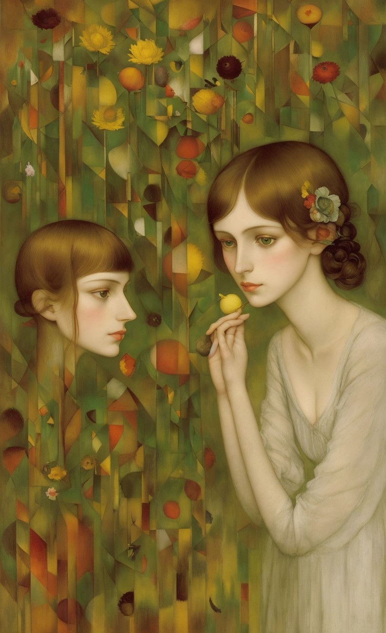 A painting of a woman in a vintage dress with her lips close to a small fruit, mirroring a hanging orb.