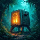 A futuristic, glowing toaster stands amidst lush greenery, emitting a warm light. Lush jungle plants surround it, while a mysterious, hovering structure adds an otherworldly ambiance.