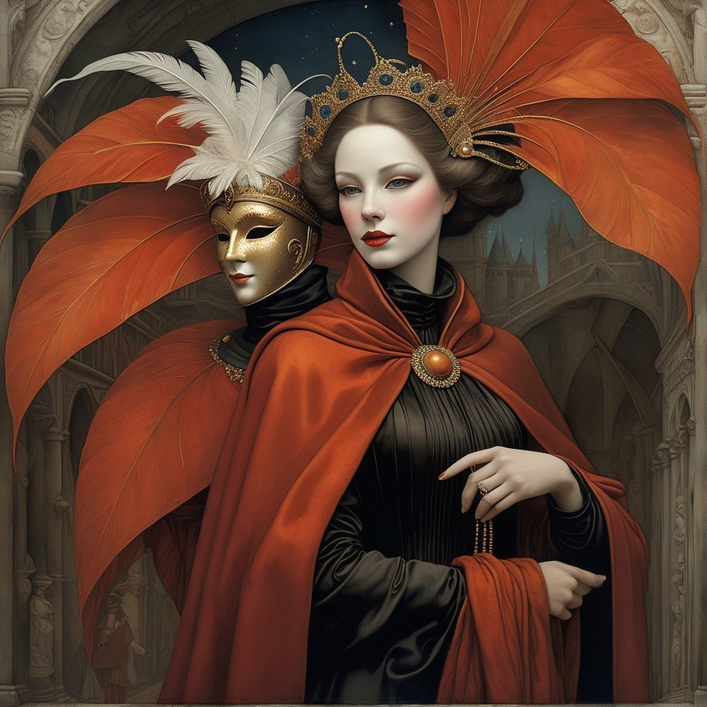 Close up, Venetian carnival festival , in the style of Alexander Jansson. by Catrin Welz-Stein, Michael Parkes. By Rob Gonsalves, Markus Pierson. Bronze tones.