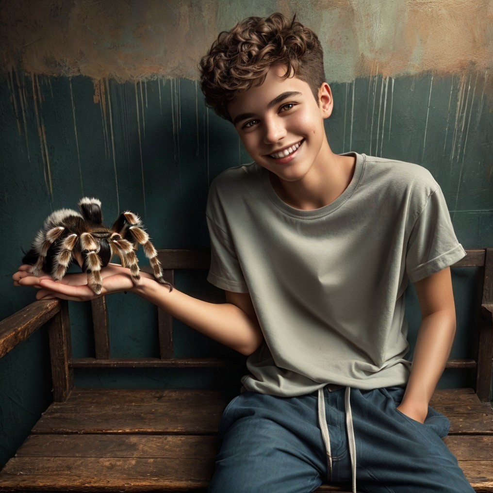 A smiling young person with curly hair holds a large tarantula on their hand against a rustic backdrop.