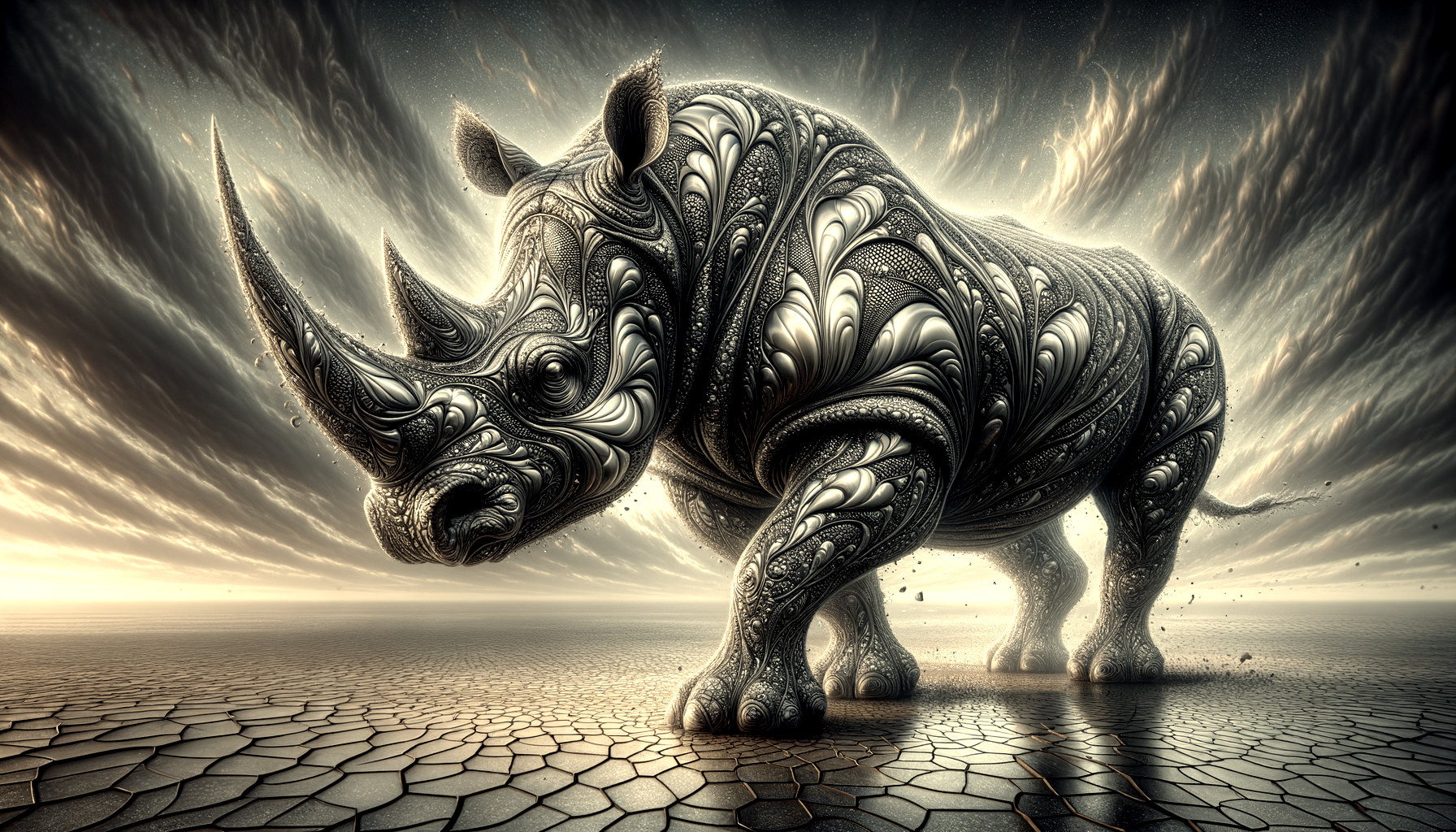 Artwork of an intricately patterned, metallic rhino on cracked ground under a dramatic sky.