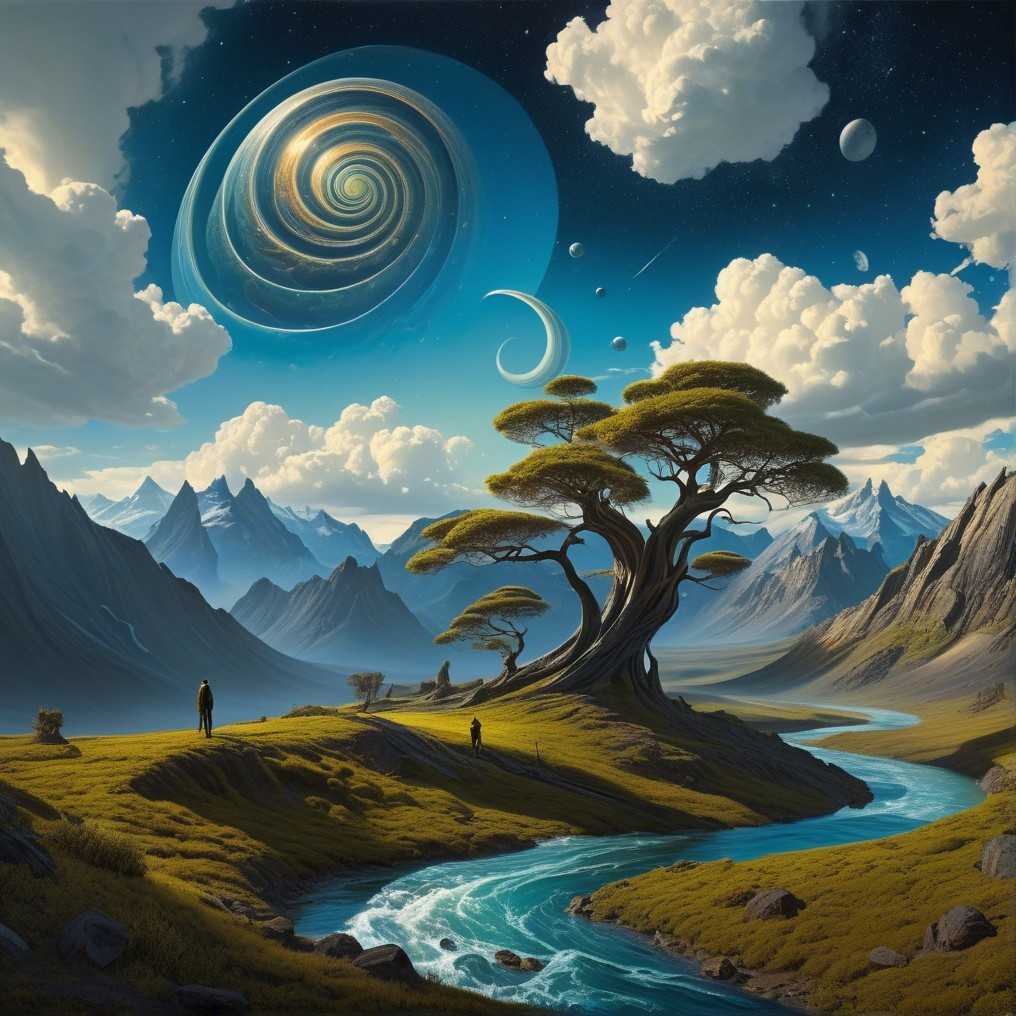 A surreal landscape features towering mountains and spires, vibrant rivers, and floating planets above, set against a bright blue sky with dramatic clouds and lush, colorful vegetation.